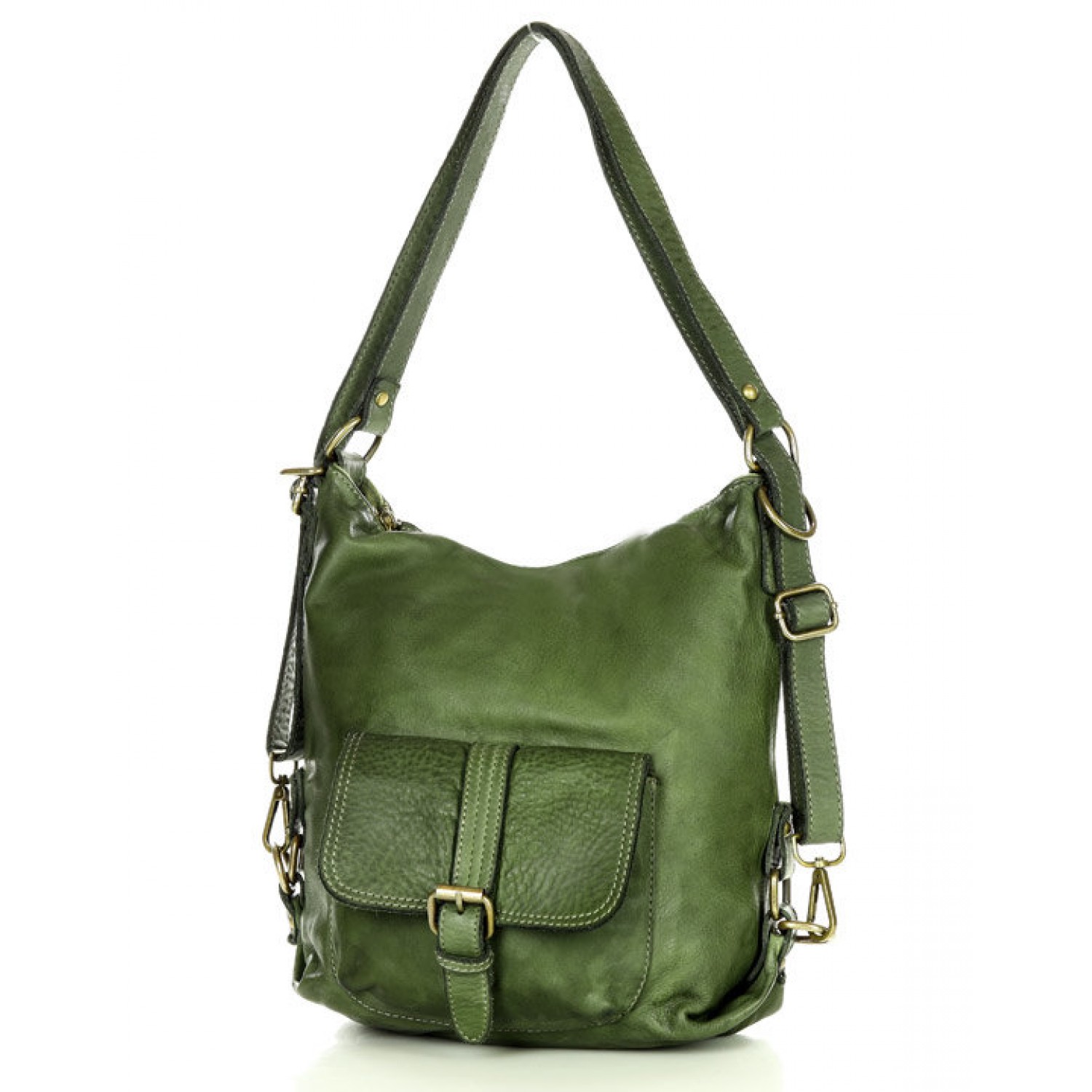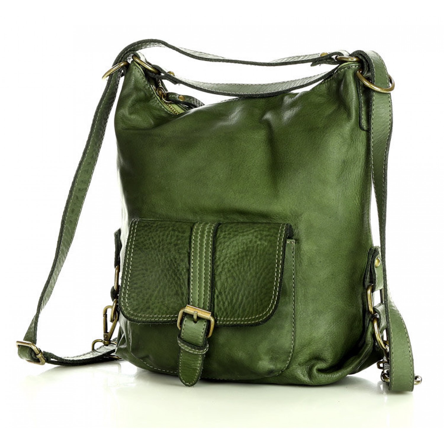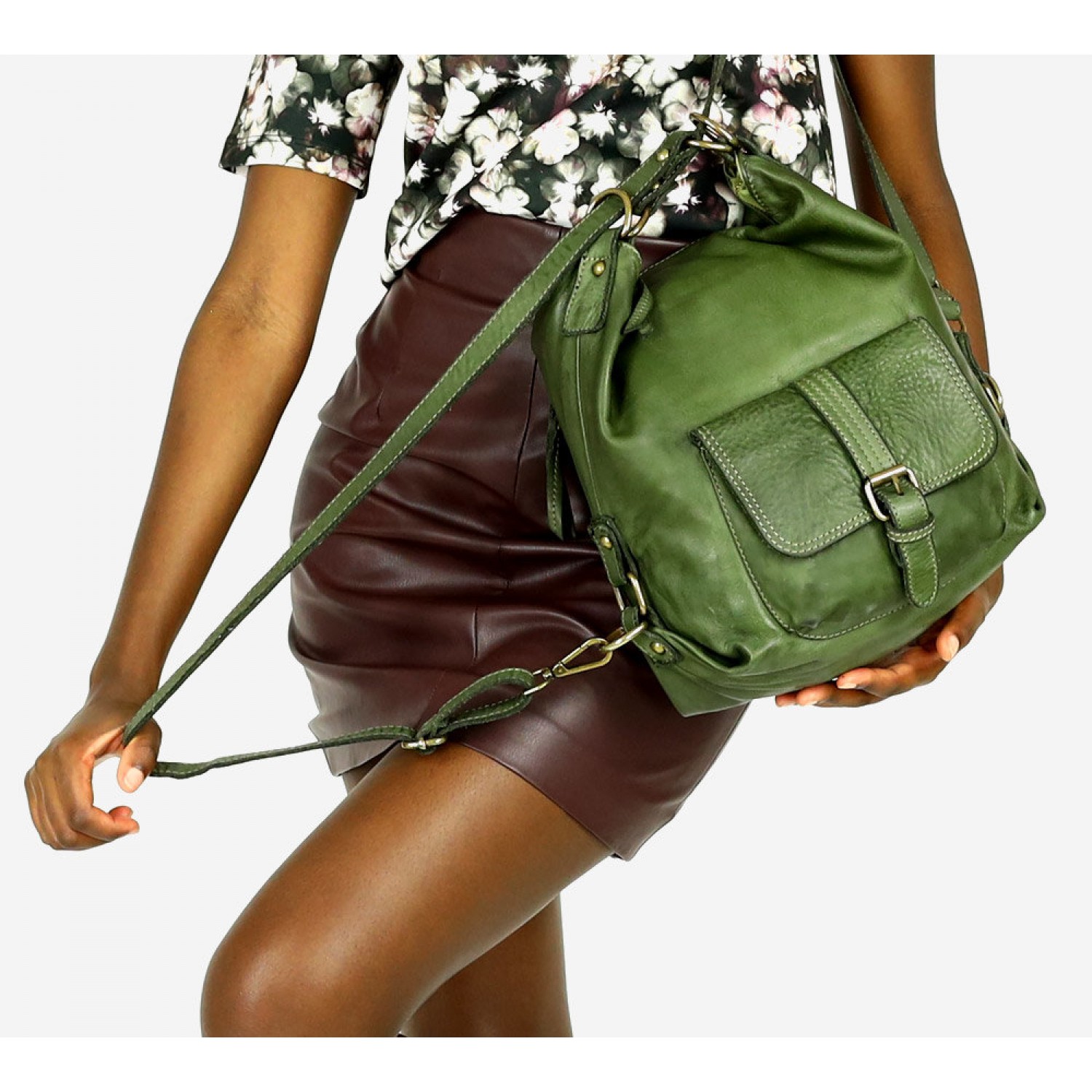 Fait-main sac à dos bandoulière 2 en 1 vert cuir femme. Sac à dos urbain - quotidien vintage cuir véritable souple italien